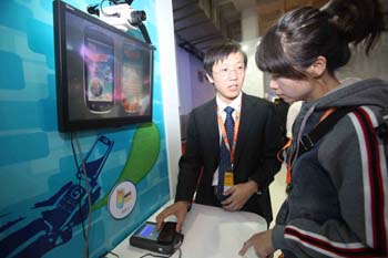 手機支付已成為新的競爭熱點,圖為在10月份舉辦的中國國際通信展上某工作人員向觀眾展示其手機支付業(yè)務。新華社記者 陳曉根/攝 |
