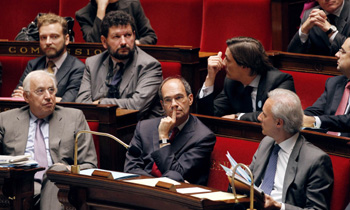 法國退休制度改革法案的最終版本27日在法國國民議會(議會下院)以336票對233票獲得通過。圖為會場上的法國勞工部長埃里克·韋爾特(前排中)。(法新社/圖) |