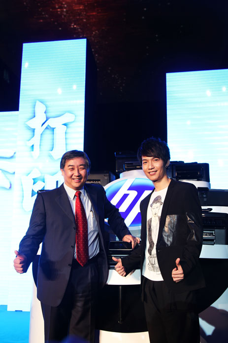 圖為惠普公司打印及成像系統(tǒng)集團(tuán)全球副總裁中國區(qū)總經(jīng)理錢越與著名歌手陳楚生共同展示9款配備云打印技術(shù)的新品打印機(jī)