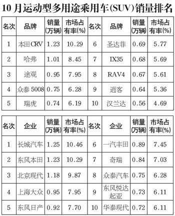 10月銷量排名前10位的SUV企業(yè)共銷售9.47萬輛,占SUV銷售總量的79.25%。