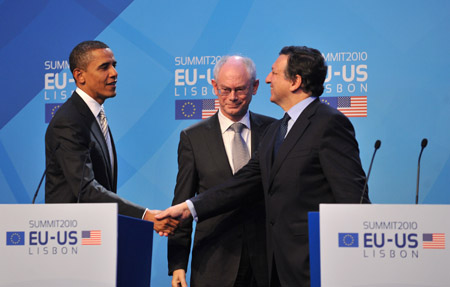 11月20日,在葡萄牙首都里斯本,歐洲理事會主席范龍佩(中)、歐盟委員會主席巴羅佐(右)和美國總統(tǒng)奧巴馬在歐盟—美國峰會后出席新聞發(fā)布會。當(dāng)天,歐盟—美國首腦會議在里斯本舉行,歐美領(lǐng)導(dǎo)人強(qiáng)調(diào)歐盟和美國應(yīng)深化跨大西洋的合作。