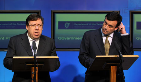 11月21日,愛爾蘭總理布賴恩·考恩(左)和財政部長布賴恩·勒尼漢在首都都柏林出席記者招待會。考恩當(dāng)晚說,愛爾蘭向歐洲聯(lián)盟(歐盟)和國際貨幣基金組織(IMF)提出的一攬子金融援助請求已經(jīng)獲得歐盟的批準(zhǔn)(相關(guān)報道見四版)