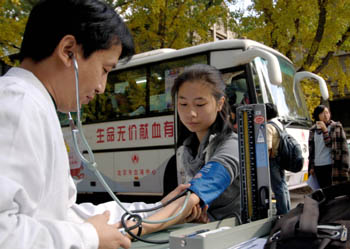 北大學(xué)子無償獻(xiàn)血應(yīng)對“血荒”。10月31日,北京大學(xué)校園內(nèi),剛滿18歲的學(xué)生韓旭測量血壓準(zhǔn)備獻(xiàn)血。 新華社發(fā)(趙琬微/攝) |