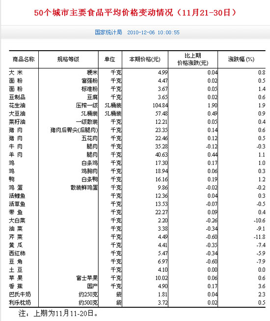 | 國(guó)家統(tǒng)計(jì)局6日發(fā)布的近期50個(gè)城市主要食品平均價(jià)格變動(dòng)情況 |