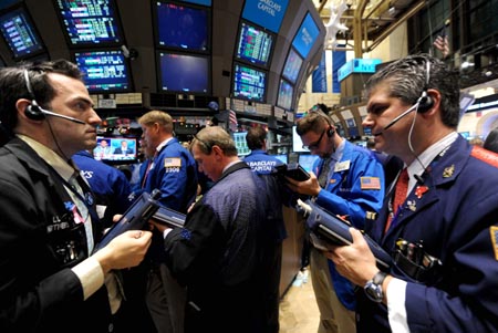 12月7日,交易員在美國(guó)紐約證券交易所內(nèi)工作。當(dāng)日,受到美國(guó)總統(tǒng)奧巴馬宣布延長(zhǎng)布什時(shí)期減稅政策的提振,最能代表市場(chǎng)趨勢(shì)的紐約股市標(biāo)準(zhǔn)普爾500指數(shù)盤中一度升至兩年最高水平,然而尾盤前的一輪跳水使得三大股指基本以平盤報(bào)收。