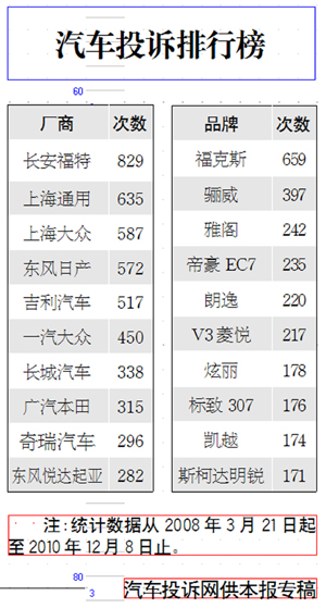 汽車投訴排行榜[2010-11-18]