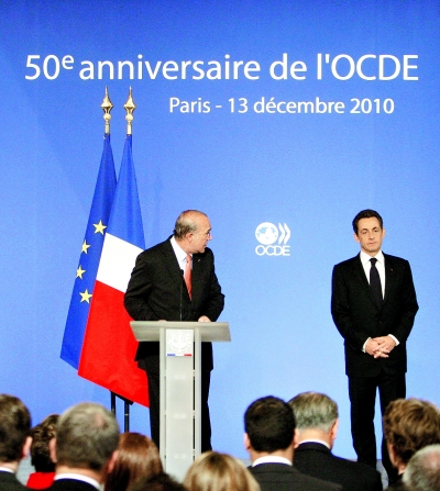 總部設(shè)在巴黎的經(jīng)濟(jì)合作與發(fā)展組織(簡(jiǎn)稱“經(jīng)合組織”,OECD)13日在法國(guó)總統(tǒng)官邸愛麗舍宮舉辦成立50周年招待會(huì)。圖為經(jīng)合組織秘書長(zhǎng)安赫爾·古里亞(左)和法國(guó)總統(tǒng)薩科齊在招待會(huì)上發(fā)表講話。該組織當(dāng)天公布的歐元區(qū)經(jīng)濟(jì)評(píng)估報(bào)告指出,歐元區(qū)貿(mào)易失衡和債務(wù)危機(jī)為后期經(jīng)濟(jì)發(fā)展蒙上陰影,目前地區(qū)層面的金融監(jiān)管和財(cái)政紀(jì)律都有待加強(qiáng)。經(jīng)合組織是成立于1961年的一個(gè)政府間國(guó)際組織,成員多為歐美和亞洲的經(jīng)濟(jì)發(fā)達(dá)國(guó)家。