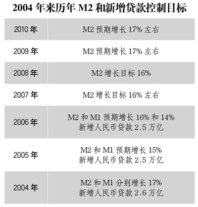 亦有媒體稱,2011年廣義貨幣供應(yīng)量M2增速目標將在16%左右;金融機構(gòu)新增貸款目標規(guī)?赡転7.5萬億左右,但這一目標規(guī)模目前尚未最終確定。