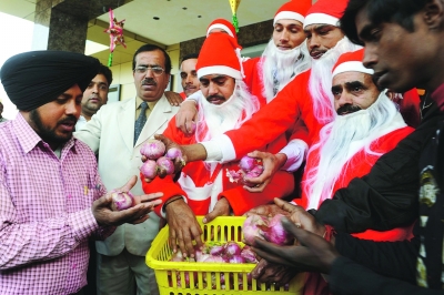 2010年12月23日,在印度阿姆利則的街道上裝扮成圣誕老人的印度人向路人發(fā)放免費的洋蔥。近日印度主食洋蔥價格暴漲,加劇了通脹風(fēng)險,引發(fā)民眾不滿。印度政府22日決定降低進口蔬菜的關(guān)稅,以控制印度主食價格。