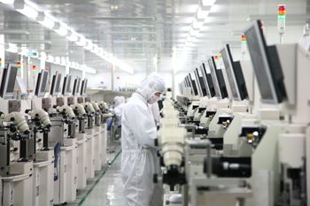 北京開發(fā)區(qū)星網(wǎng)工業(yè)園匯聚了全球20多家頂級(jí)通信企業(yè),形成了全球獨(dú)一無二的零庫存“星網(wǎng)模式”。圖為開發(fā)區(qū)威訊公司生產(chǎn)線。 |