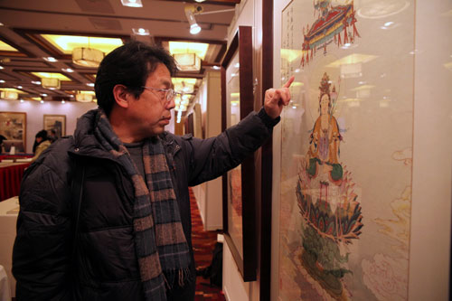 2010年12月27日,一位客戶在觀看夏荊山的佛教繪畫作品。當(dāng)日,歷代名畫記“年終客戶答謝暨2011年復(fù)制書畫禮品推介展”在北京國(guó)際飯店會(huì)議中心舉行。