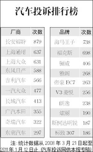 汽車投訴排行榜[2011-01-06]