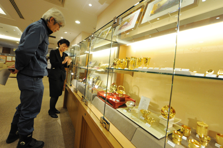 1月18日,在日本東京市中心的一家金店里,一位投資者購買金條。在日本,由于對日幣和經(jīng)濟的擔心導(dǎo)致了黃金產(chǎn)品旺銷。近期有消息稱,到2015年,日本全國債務(wù)規(guī)模將達到GDP的250%,為世界最高。
