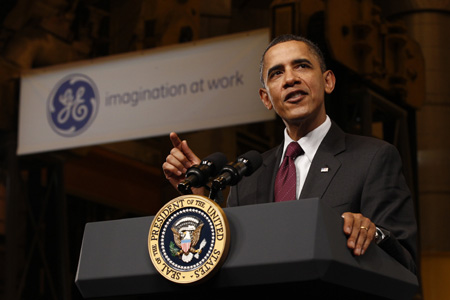 美國總統(tǒng)奧巴馬當地時間22日在每周例行電臺演說中釋放出“支持經濟增長、支持貿易”的信息。有消息稱,奧巴馬在當地時間25日發(fā)表的國情咨文,將以“制造就業(yè)機會,提高美國競爭力,增加基礎設施、教育和研究開支,削減國債”為主軸。 圖為奧巴馬當地時間21日走訪通用電氣公司總部時發(fā)表演講。