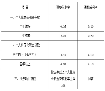 二、從2011年2月9日起,上調(diào)個人住房公積金貸款利率。五年期以上個人住房公積金貸款利率上調(diào)0.20個百分點(diǎn),由4.30%上調(diào)至4.50%;五年期以下(含五年)個人住房公積金貸款利率上調(diào)0.25個百分點(diǎn),由3.75%上調(diào)至4.00%。