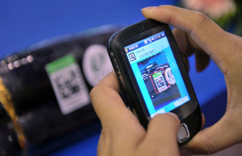 海南省加緊建設瓜菜質量監(jiān)管物聯(lián)網(wǎng),圖為工作人員正在演示用手機掃描瓜菜上的二維碼標貼。記者 郭程