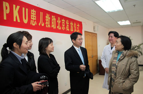 2011年1月30日,衛(wèi)生部婦幼保健與社區(qū)衛(wèi)生司兒童處處長(zhǎng)曹彬(右一)在活動(dòng)儀式上與美贊臣營(yíng)養(yǎng)品(中國(guó))有限公司華北區(qū)總經(jīng)理陳國(guó)憫(右三)交流。當(dāng)日,國(guó)內(nèi)首個(gè)以援助苯丙酮尿癥(簡(jiǎn)稱(chēng)PKU)孩子為宗旨的“希望花開(kāi)基金”P(pán)KU患兒救助發(fā)放儀式在北京婦幼保健院舉行。據(jù)介紹,苯丙酮尿癥是一種先天性代謝疾病,可引起大腦及神經(jīng)系統(tǒng)損傷,為了免受智力損傷,PKU患者必須終生進(jìn)食人工合成的特殊事物,大部分PKU家庭因此陷入經(jīng)濟(jì)與精神的雙重困境!跋Mㄩ_(kāi)基金”的成立以及在全國(guó)開(kāi)展的“希望花開(kāi),愛(ài)捐行動(dòng)”,旨在呼吁更多人一起關(guān)注這個(gè)群體,并且給PKU孩子和家庭提供持續(xù)的援助。