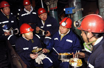 農(nóng)歷大年初一,山西焦煤汾西礦業(yè)集團領(lǐng)導(dǎo)走進新柳煤礦生產(chǎn)一線,為堅守生產(chǎn)崗位的礦工送來年飯,共進午餐。記者 武敵/攝 |