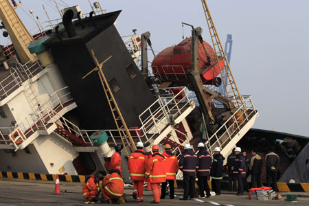當(dāng)日凌晨3時(shí)左右,來(lái)自朝鮮的塞拉利昂籍貨輪“日光聯(lián)”號(hào)裝載著125箱集裝箱停靠在大連大窯灣港DCT一期碼頭9號(hào)泊位。在集裝箱作業(yè)過(guò)程中,船體發(fā)生嚴(yán)重傾斜。事發(fā)后,救援隊(duì)立即趕赴現(xiàn)場(chǎng)實(shí)施救援。目前,船上17名朝鮮籍船員全部安全轉(zhuǎn)移,船體已恢復(fù)正常,貨輪泄漏的燃油正在清理,事故原因尚在調(diào)查。