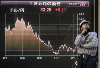 2月22日,在日本東京,一名工人站在顯示日元匯率的屏幕前。新華社/路透 |