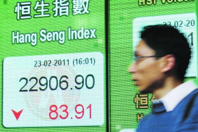 2月23日,市民從香港中環(huán)一家銀行的恒生指數(shù)電子顯示屏前走過(guò)。當(dāng)日,香港恒生指數(shù)跌83.91點(diǎn),報(bào)收于22906.90點(diǎn)。當(dāng)天,日本東京股市日經(jīng)225種股票平均價(jià)格指數(shù)較前一交易日跌幅為0.80%。韓國(guó)首爾股市綜合指數(shù)跌幅為0.42%。菲律賓馬尼拉股市主要股指跌幅為0.71%。新加坡股市海峽時(shí)報(bào)指數(shù)跌幅為0.57%。印度孟買(mǎi)股市敏感30指數(shù)跌幅為0.64%。澳大利亞悉尼股市主要股指跌幅為0.22%。當(dāng)天,新西蘭股市NZX-50指數(shù)上漲13.36點(diǎn),漲幅為0.40%。
