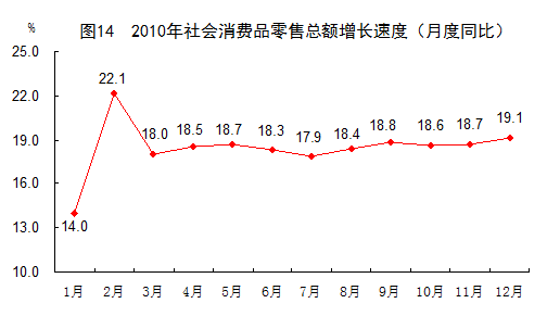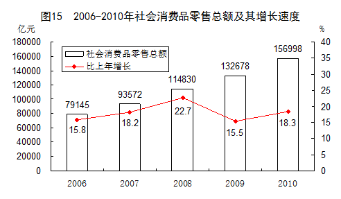 五、國內(nèi)貿(mào)易 全年社會消費品零售總額156998億元,比上年增長18.3%,扣除價格因素,實際增長14.8%。按經(jīng)營地統(tǒng)計[8],城鎮(zhèn)消費品零售額136123億元,增長18.7%;鄉(xiāng)村消費品零售額20875億元,增長16.2%。按消費形態(tài)統(tǒng)計,商品零售額139350億元,增長18.4%;餐飲收入額17648億元,增長18.1%。