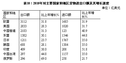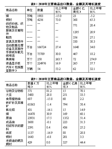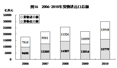 在限額以上企業(yè)商品零售額中,汽車類零售額比上年增長34.8%,糧油類增長27.9%,肉禽蛋類增長21.7%,服裝類增長25.8%,日用品類增長25.1%,文化辦公用品類增長23.5%,通訊器材類增長21.8%,化妝品類增長16.6%,金銀珠寶類增長46.0%,中西藥品類增長23.5%,家用電器和音像器材類增長27.7%,家具類增長37.2%,建筑及裝潢材料類增長32.3%。 六、對外經(jīng)濟 全年貨物進出口總額29728億美元,比上年增長34.7%。其中,貨物出口15779億美元,增長31.3%;貨物進口13948億美元,增長38.7%。進出口差額(出口減進口)1831億美元,比上年減少126億美元。