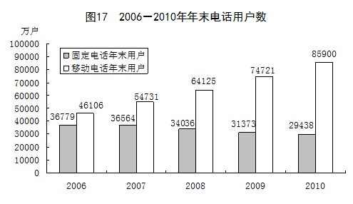 全年規(guī)模以上港口完成貨物吞吐量80.2億噸,比上年增長15.0%,其中外貿(mào)貨物吞吐量24.6億噸,增長13.6%。港口集裝箱吞吐量14500萬標準箱,增長18.8%。 年末全國民用汽車保有量達到9086萬輛(包括三輪汽車和低速貨車1284萬輛),比上年末增長19.3%,其中私人汽車保有量6539萬輛,增長25.3%。民用轎車保有量4029萬輛,增長28.4%,其中私人轎車3443萬輛,增長32.2%。 全年完成郵電業(yè)務(wù)總量[9]32940億元,比上年增長20.6%。其中,郵政業(yè)務(wù)總量1985億元,增長21.6%;電信業(yè)務(wù)總量30955億元,增長20.5%。全年局用交換機容量減少2707萬門,總?cè)萘?6559萬門;新增移動電話交換機容量[10]6433萬戶,達到150518萬戶。固定電話年末用戶29438萬戶。其中,城市電話用戶19662萬戶,農(nóng)村電話用戶9776萬戶。新增移動電話用戶11179萬戶,年末達到85900萬戶。其中,3G移動電話用戶[11]4705萬戶。年末全國固定及移動電話用戶總數(shù)達到115339萬戶,比上年末增加9244萬戶。電話普及率達到86.5部/百人;ヂ(lián)網(wǎng)上網(wǎng)人數(shù)4.57億人,其中寬帶上網(wǎng)人數(shù)4.50億人;互聯(lián)網(wǎng)普及率達到34.3%。