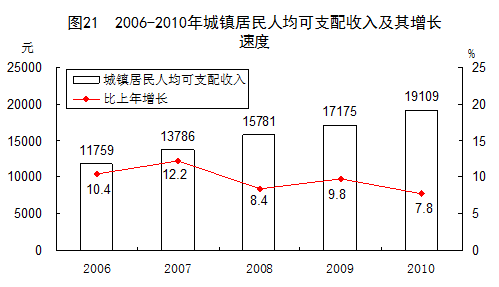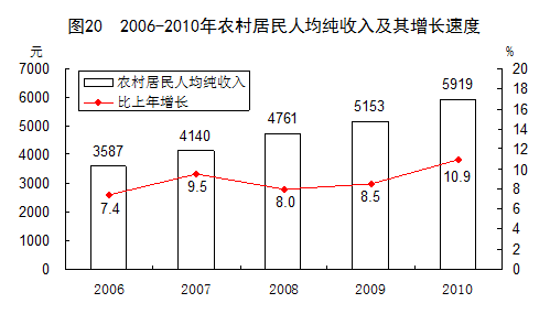 全年農(nóng)村居民人均純收入5919元,剔除價格因素,比上年實際增長10.9%;城鎮(zhèn)居民人均可支配收入19109元,實際增長7.8%。農(nóng)村居民家庭食品消費支出占消費總支出的比重為41.1%,城鎮(zhèn)為35.7%。按2010年農(nóng)村貧困標準1274元測算,年末農(nóng)村貧困人口為2688萬人,比上年末減少909萬人。