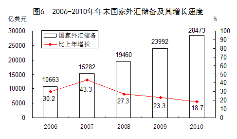 年末國家外匯儲備28473億美元,比上年末增加4481億美元。年末人民幣匯率為1美元兌6.6227元人民幣,比上年末升值3.0%。