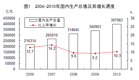 2011年2月28日 2010年,面對復(fù)雜多變的國內(nèi)外經(jīng)濟環(huán)境和各種重大挑戰(zhàn),全國各族人民在黨中央、國務(wù)院的堅強領(lǐng)導下,以鄧小平理論和“三個代表”重要思想為指導,深入貫徹落實科學發(fā)展觀,堅持實施應(yīng)對國際金融危機沖擊的一攬子計劃,加快轉(zhuǎn)變經(jīng)濟發(fā)展方式和經(jīng)濟結(jié)構(gòu)戰(zhàn)略性調(diào)整,國民經(jīng)濟保持了平穩(wěn)較快發(fā)展,各項社會事業(yè)取得新的進步。 一、綜合 初步核算,全年國內(nèi)生產(chǎn)總值[2]397983億元,比上年增長10.3%。其中,第一產(chǎn)業(yè)增加值40497億元,增長4.3%;第二產(chǎn)業(yè)增加值186481億元,增長12.2%;第三產(chǎn)業(yè)增加值171005億元,增長9.5%。第一產(chǎn)業(yè)增加值占國內(nèi)生產(chǎn)總值的比重為10.2%,第二產(chǎn)業(yè)增加值比重為46.8%,第三產(chǎn)業(yè)增加值比重為43.0%。