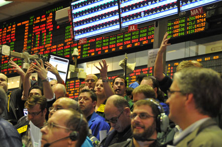 2月28日,工作人員在美國芝加哥商品交易所農(nóng)產(chǎn)品交易池忙碌。