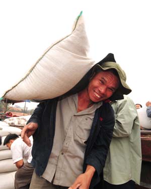 1月31日,在廣西東興邊民互市貿(mào)易區(qū),扛包工在搬運(yùn)貨物。由于春節(jié)效應(yīng)使得近期中國(guó)對(duì)淀粉、芝麻的需求增加,碼頭處這兩種貨物的交易非常熱火。記者 黃孝邦/攝 |