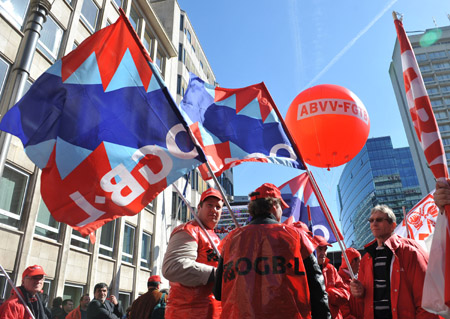 3月24日,在比利時(shí)首都布魯塞爾,示威者高舉旗幟參加反對(duì)歐盟緊縮政策的游行。 當(dāng)天,歐盟舉行春季首腦會(huì)議,將通過整治歐洲主權(quán)債務(wù)危機(jī)的全面應(yīng)對(duì)方案。由于方案中一些緊縮政策涉及普通民眾的利益,因此招致工會(huì)的反對(duì)。大約2萬多名歐盟各國的工人24日走上布魯塞爾街頭舉行示威游行。