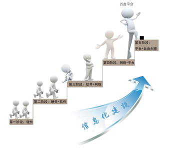 一是硬件為主的階段,電腦主要當(dāng)打字機和計算器使用;二是硬件+軟件的階段,以各種基于客戶端的獨立應(yīng)用軟件為主導(dǎo);三是軟件+網(wǎng)絡(luò)的階段,各種基于局域網(wǎng)、專網(wǎng)和互聯(lián)網(wǎng)的多機版軟件紛紛出現(xiàn);四是網(wǎng)絡(luò)+平臺的階段,以基于互聯(lián)網(wǎng)、移動互聯(lián)網(wǎng)的流程化信息應(yīng)用平臺為主導(dǎo);五是平臺+自由創(chuàng)意的階段,信息應(yīng)用平臺可為使用者提供前所未有的自由度,滿足從流程化溝通到非流程化溝通,從當(dāng)前顯需求到未來潛需求,從移動互聯(lián)網(wǎng)到物聯(lián)網(wǎng)的全方位信息化需求,平臺使用者可自主進(jìn)行很多創(chuàng)造性的應(yīng)用,既是平臺上的演員,又是平臺上的導(dǎo)演。