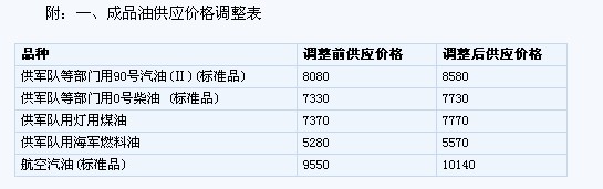 (一)成品油生產(chǎn)經(jīng)營企業(yè)供軍隊(duì)及新疆生產(chǎn)建設(shè)兵團(tuán)、國家儲(chǔ)備用汽、柴油(標(biāo)準(zhǔn)品,下同)供應(yīng)價(jià)格每噸分別提高500元和400元,調(diào)整后的汽、柴油供應(yīng)價(jià)格分別為每噸8580元和7730元。其他成品油價(jià)格相應(yīng)調(diào)整。調(diào)整后的成品油標(biāo)準(zhǔn)品價(jià)格見附表一。非標(biāo)準(zhǔn)品價(jià)格由成品油生產(chǎn)經(jīng)營企業(yè)按照國家規(guī)定的品質(zhì)比率確定。 (二)供交通、民航等專項(xiàng)用戶汽、柴油最高供應(yīng)價(jià)格等額提高。調(diào)整后的汽、柴油標(biāo)準(zhǔn)品最高供應(yīng)價(jià)格每噸分別為8980元和8130元。非標(biāo)準(zhǔn)品最高供應(yīng)價(jià)格由成品油生產(chǎn)經(jīng)營企業(yè)按照國家規(guī)定的品質(zhì)比率確定。其中,供鐵道、漁業(yè)、林業(yè)、農(nóng)墾用汽、柴油價(jià)格暫按供軍隊(duì)用油價(jià)格執(zhí)行。 對(duì)符合資質(zhì)的民營批發(fā)企業(yè)最高供應(yīng)價(jià)格,按最高零售價(jià)格扣減400元確定。當(dāng)市場(chǎng)零售價(jià)格降低時(shí),對(duì)民營批發(fā)企業(yè)的供應(yīng)價(jià)格也要相應(yīng)降低,保持價(jià)差不小于400元。 具體供應(yīng)價(jià)格可在不超過最高供應(yīng)價(jià)格的前提下,由供需雙方協(xié)商確定。 (三)各地汽、柴油最高零售價(jià)格等額提高。調(diào)整后各省(區(qū)、市)和中心城市汽、柴油最高零售價(jià)格水平見附表二。各省(區(qū)、市)價(jià)格主管部門按規(guī)定的品質(zhì)比率調(diào)整汽、柴油非標(biāo)準(zhǔn)品最高零售價(jià)格。 成品油零售企業(yè)可在不超過最高零售價(jià)格的前提下,自主制定具體零售價(jià)格。 (四)汽、柴油最高批發(fā)價(jià)格等額提高。合同約定由供方配送到零售企業(yè)的,最高批發(fā)價(jià)格按最高零售價(jià)格倒扣300元確定;合同未約定配送的,最高批發(fā)價(jià)格由各省(區(qū)、市)價(jià)格主管部門在300元的基礎(chǔ)上,再考慮運(yùn)雜費(fèi)因素確定。當(dāng)市場(chǎng)零售價(jià)格降低時(shí),批發(fā)價(jià)格也要相應(yīng)降低,保持批零價(jià)差不小于300元。各省(區(qū)、市)價(jià)格主管部門按規(guī)定的品質(zhì)比率制定非標(biāo)準(zhǔn)品最高批發(fā)價(jià)格。 成品油批發(fā)企業(yè)可在不超過最高批發(fā)價(jià)格的前提下,與零售企業(yè)協(xié)商確定具體批發(fā)價(jià)格。 (五)液化氣最高出廠價(jià)格按照與供軍隊(duì)等部門用90號(hào)汽油供應(yīng)價(jià)格保持0.92:1的比價(jià)關(guān)系確定,供需雙方可在不超過最高出廠價(jià)格的前提下協(xié)商確定具體價(jià)格。 (六)調(diào)整后的價(jià)格自2011年4月7日零時(shí)起執(zhí)行。