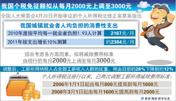 謝旭人表示,草案擬將減除費用標準由現(xiàn)行的每月2000元上調(diào)至每月3000元,調(diào)整后,工薪所得納稅人占全部工薪收入人群的比重,將由目前的28%下降到12%左右。