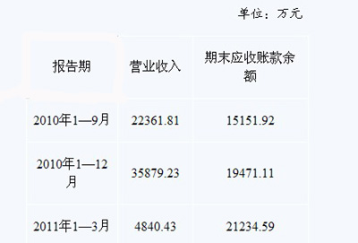根據(jù)上述資料,劉先生算了一筆賬:截至2011年一季度末沃森生物賬齡1-6個(gè)月的應(yīng)收賬款余額為21234.59×92%=19535.82萬(wàn)元。假設(shè)一季度營(yíng)業(yè)收入全部形成應(yīng)收賬款,則2010年第四季度新形成的應(yīng)收賬款為19535.82-4840.43=14695.39萬(wàn)元。而沃森生物去年第四季度實(shí)現(xiàn)營(yíng)業(yè)收入為13517.42萬(wàn)元(35879.23-22361.81)!拔稚锶ツ甑谒募径刃掳l(fā)生的應(yīng)收賬款竟然高于當(dāng)季的營(yíng)業(yè)收入,另人匪夷所思!眲⑾壬f(shuō)。