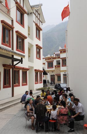步行在以土黃色為基調(diào)的新映秀鎮(zhèn)的大街小巷,坐在街邊竹椅上曬著太陽的老人、奔跑在巷道嬉戲歡快的孩童、忙著裝修或打掃收拾新房的男女,無不散露出一種溫暖。汶川縣縣長張通榮對(duì)記者說,我們用藏、羌、漢等多民族風(fēng)格建造民房盡力讓它不單調(diào);我們沿河做景觀、做綠化,盡力讓過境湍流能為小鎮(zhèn)帶來生趣、祥和;我們建造抗震救災(zāi)紀(jì)念館,盡力營造“祭奠逝者、感恩愛者、溫暖生者”的氣氛……讓“災(zāi)難的小鎮(zhèn)”變成一個(gè)“溫情的小鎮(zhèn)”。