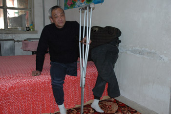 依靠一條假肢,50多歲的袁寶福一路蹣跚著回到家里,劇烈的疼痛讓他黑瘦的額頭沁出滴滴汗珠!耙晃慌笥褎偛沤o我買了件襯衫,原來的那件實在穿不下去了,自己又沒錢買……”