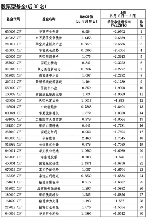 華商基金管理有限公司旗下,2010年6月成立的華商產(chǎn)業(yè)升級以-2.95%的凈值增長率成為本周(5月12日-18日)股票型基金收益倒數(shù)第一,其今年年漲幅為-12.71%。