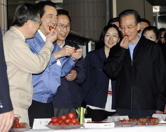 下午,溫家寶和日本首相菅直人、韓國總統(tǒng)李明博一同訪問了福島縣福島市。在接待室里,菅直人請溫家寶和李明博一起品嘗了福島縣出產(chǎn)的櫻桃和小番茄。