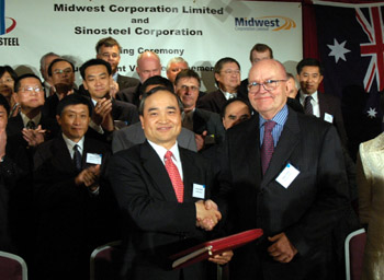 2005年10月18日,在西澳大利亞州首府珀斯,中國中鋼集團(tuán)總裁黃天文(前左)同澳大利亞中西部鐵礦公司總裁泰勒簽署合作開發(fā)鐵礦的合資項(xiàng)目協(xié)議后握手。記者