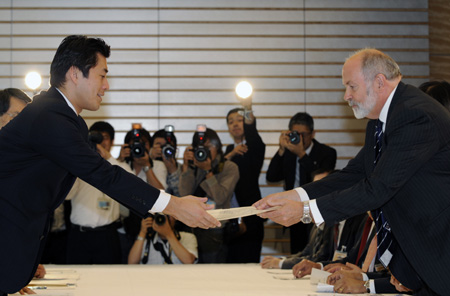 6月1日,在位于日本東京的首相官邸,國際原子能機(jī)構(gòu)調(diào)查團(tuán)團(tuán)長韋特曼(右)向日本首相輔佐官細(xì)野豪志遞交調(diào)查報告概要。