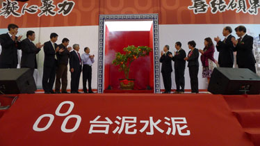 | 圖為:臺(tái)泥安順一期竣工慶典儀式上,眾領(lǐng)導(dǎo)嘉賓與臺(tái)泥董事長辜成允等高層共同“喜迎碩果”。 |
