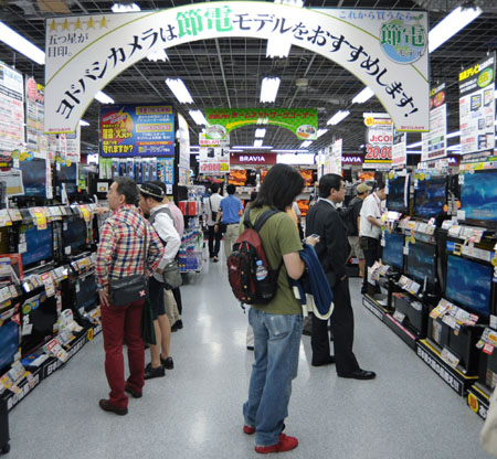 6月9日,在東京秋葉原的淀橋相機連鎖百貨店(Yodobashi Camera)里的專賣電視的商場。 由于日本福島第一核電站事故以及其后續(xù)效應(yīng)所導(dǎo)致的日本全國大范圍的電力供應(yīng)緊張,日本廠商和家電賣場積極推廣節(jié)能電力的空調(diào),電風扇,LED燈等家用電器。