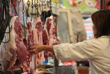 6月14日,市民在青島一農(nóng)貿(mào)市場(chǎng)購(gòu)買豬肉。新華社發(fā)(黃杰顯攝) |