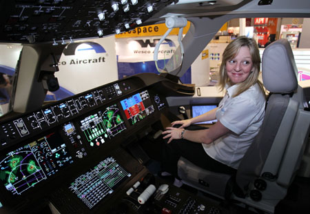 6月20日,在巴黎航展上,一名外國航空公司的工作人員在C919客機駕駛室參觀。 當日,第49屆巴黎航展開幕,中國自主研制的大型客機C919樣機在航展亮相,這也是C919大型客機1:1展示樣機(機身前段)首次在國際最具影響力的航展上亮相。