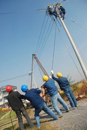 余杭供電局大力開展新農(nóng)村電氣化建設(shè),讓農(nóng)民與居民享受一樣的用電待遇。圖為余杭供電所農(nóng)電班的員工們正在為新豎起的電桿拉線。姚學(xué)恒