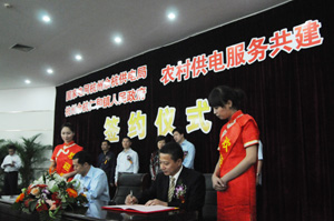 余杭供電局局長童鈞(左)與仁和鎮(zhèn)簽訂《農(nóng)村供電服務(wù)共建協(xié)議》。姚學(xué)恒
